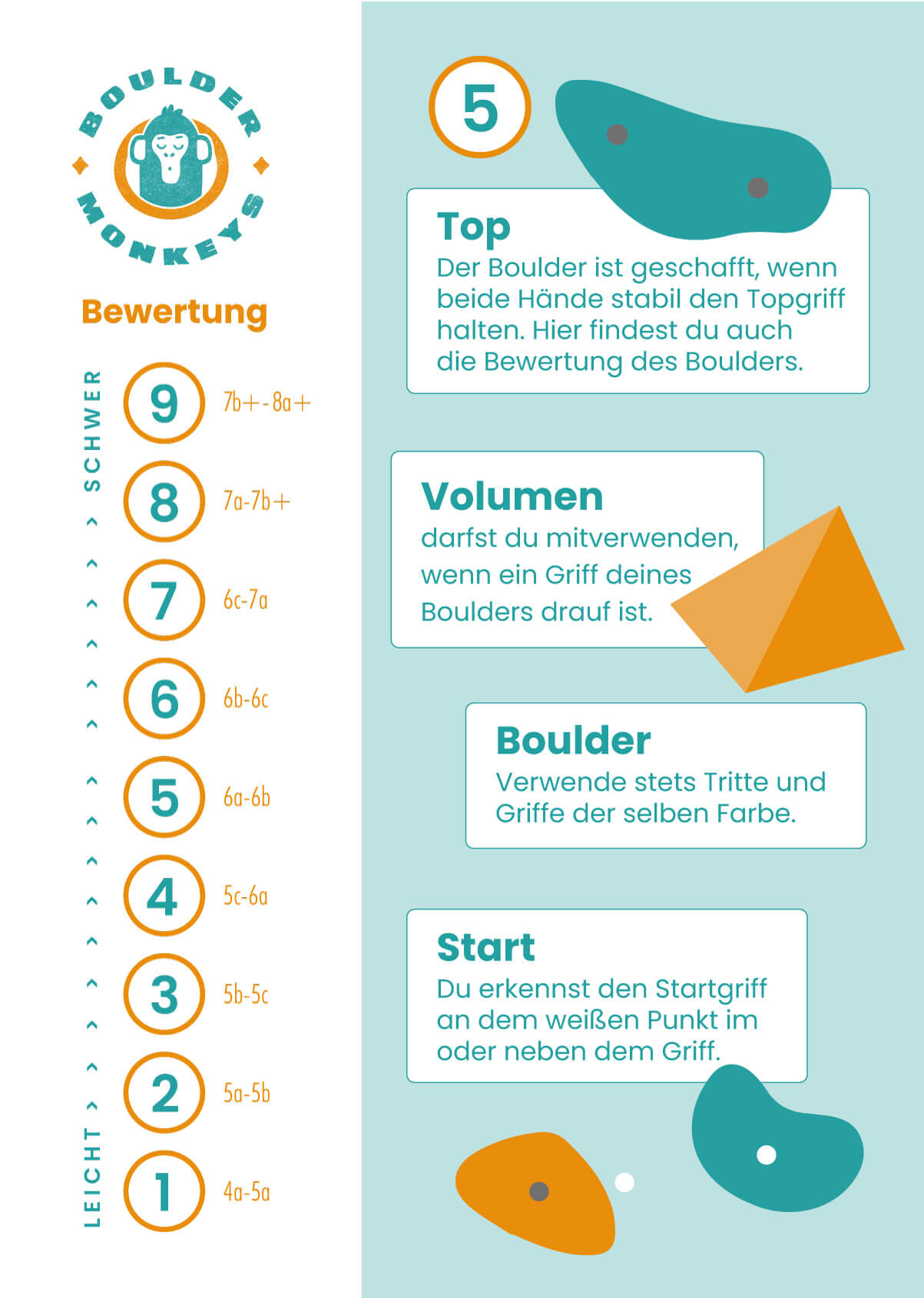 Suche dir einen Boulder in der Schwierigkeit 1-3 (Markierung oberster Griff).